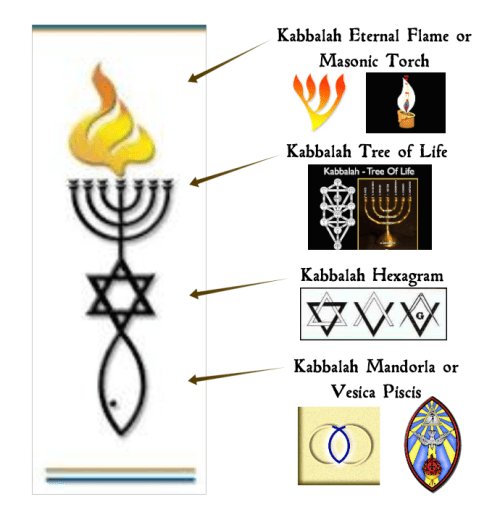 Detailed analyses of Messianic seal and Kabbalah/ Freemasonry symbols; Tree of Life, menorah, hexagram, vesica piscis, fish symbol, eternal flame, Baphomet.